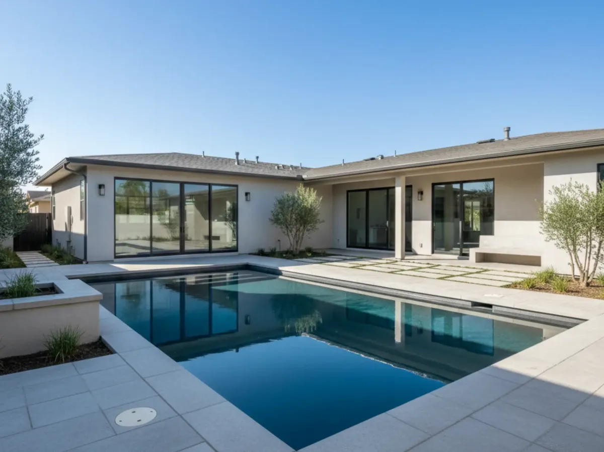 Clean lines and bold geometric shapes define this modern design. The layout creates a smooth, seamless indoor-outdoor flow. It blends style with functionality. Perfect for a contemporary, elegant look.